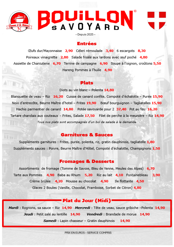 Derrière le Bouillon Savoyard, une équipe passionnée vous accueille chaque jour avec le sourire et l’envie de partager l’esprit convivial des tables d’antan. En cuisine, notre chef met à l’honneur les recettes généreuses françaises, préparées avec authenticité et savoir-faire.